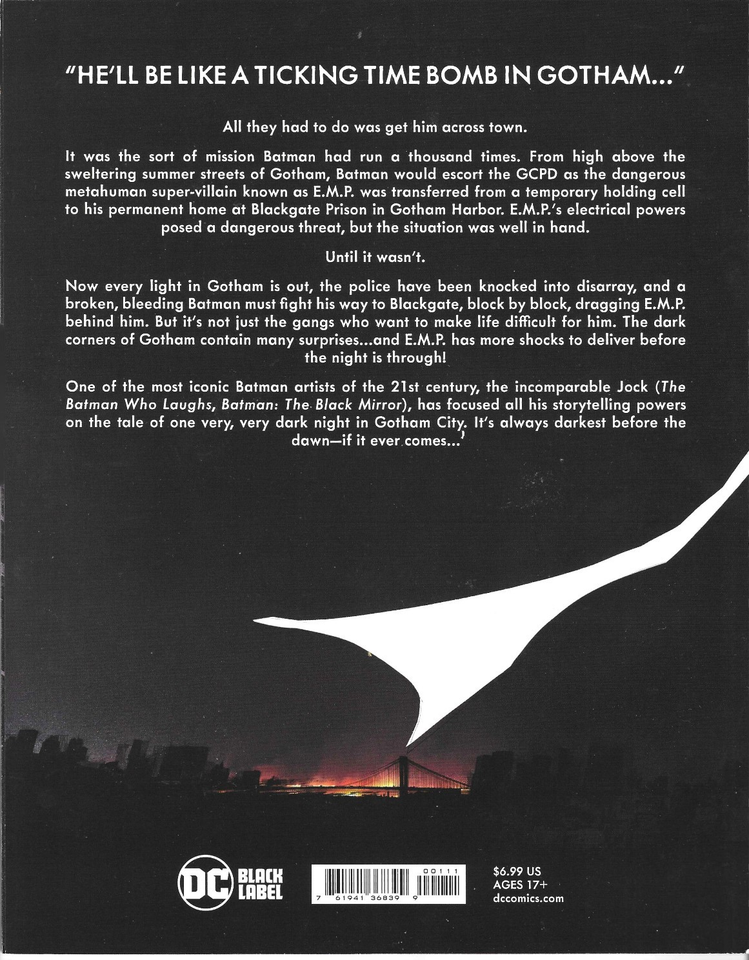 A city plunged into darkness. A hero pushed to his absolute limit. From the visionary mind of superstar creator Jock, this complete, self-contained epic follows Batman on a single, hellish night. During a city-wide blackout, he must transport a super-villain across a Gotham that has descended into chaos. With no Batmobile and no gadgets, it's a brutal, street-level fight for survival against a city full of predators.